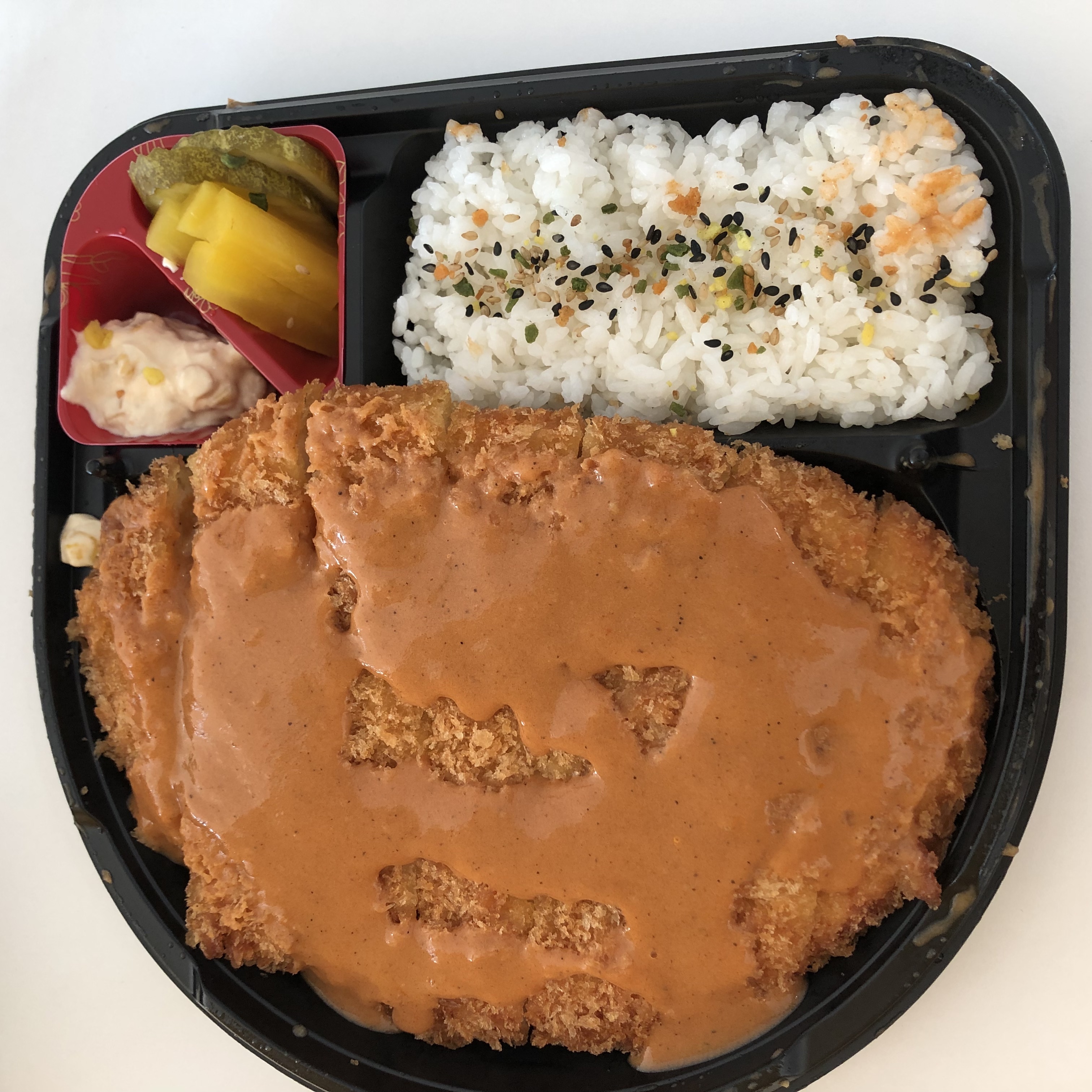 전자렌지에 데울 때는 돈까스에 소스를 뿌린 후에 우측 상단의 반찬을 빼고 돌려야 한다.