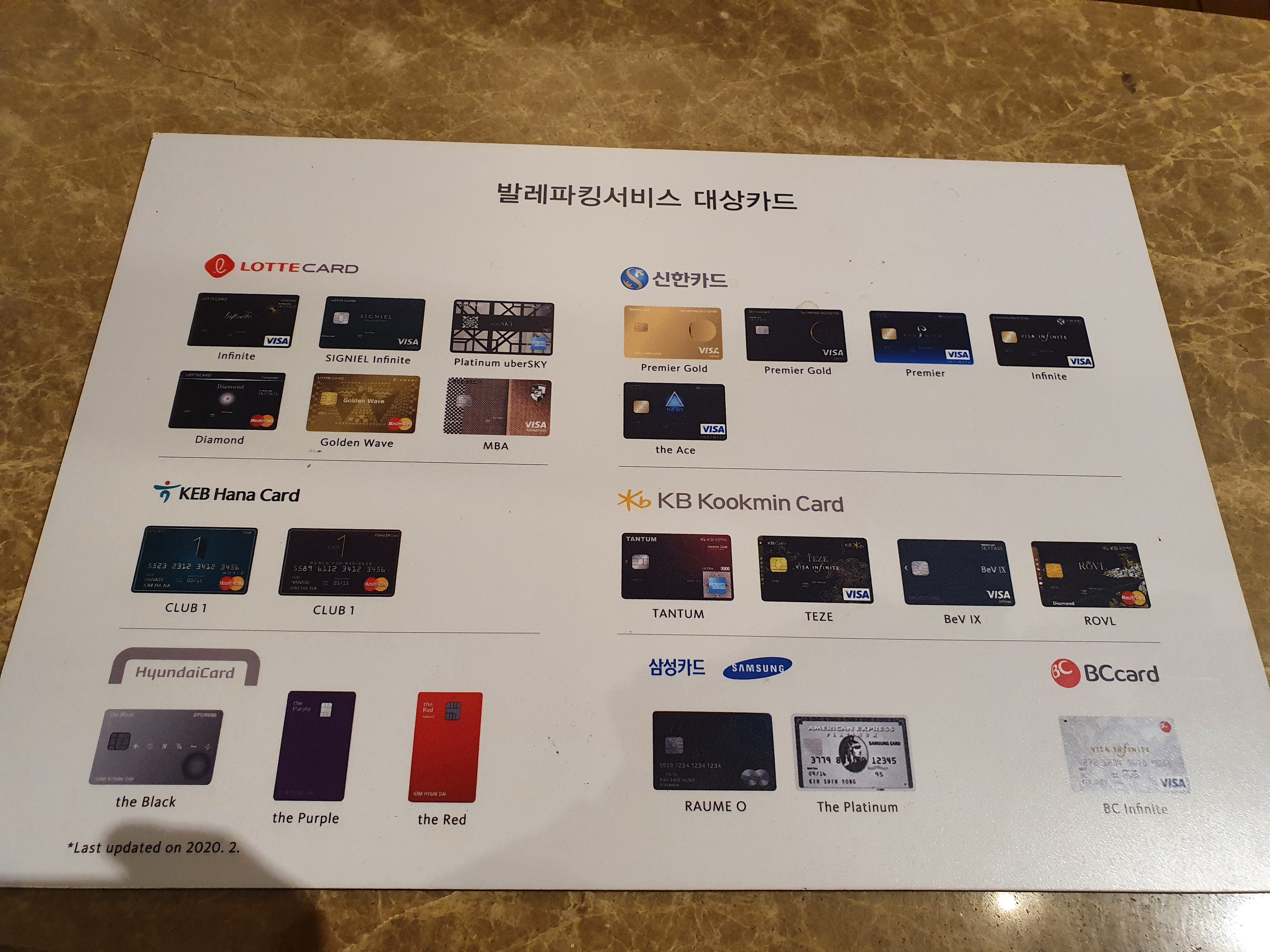 롯데호텔 제주 발렛파킹 제휴카드 (2020년 11월 기준)