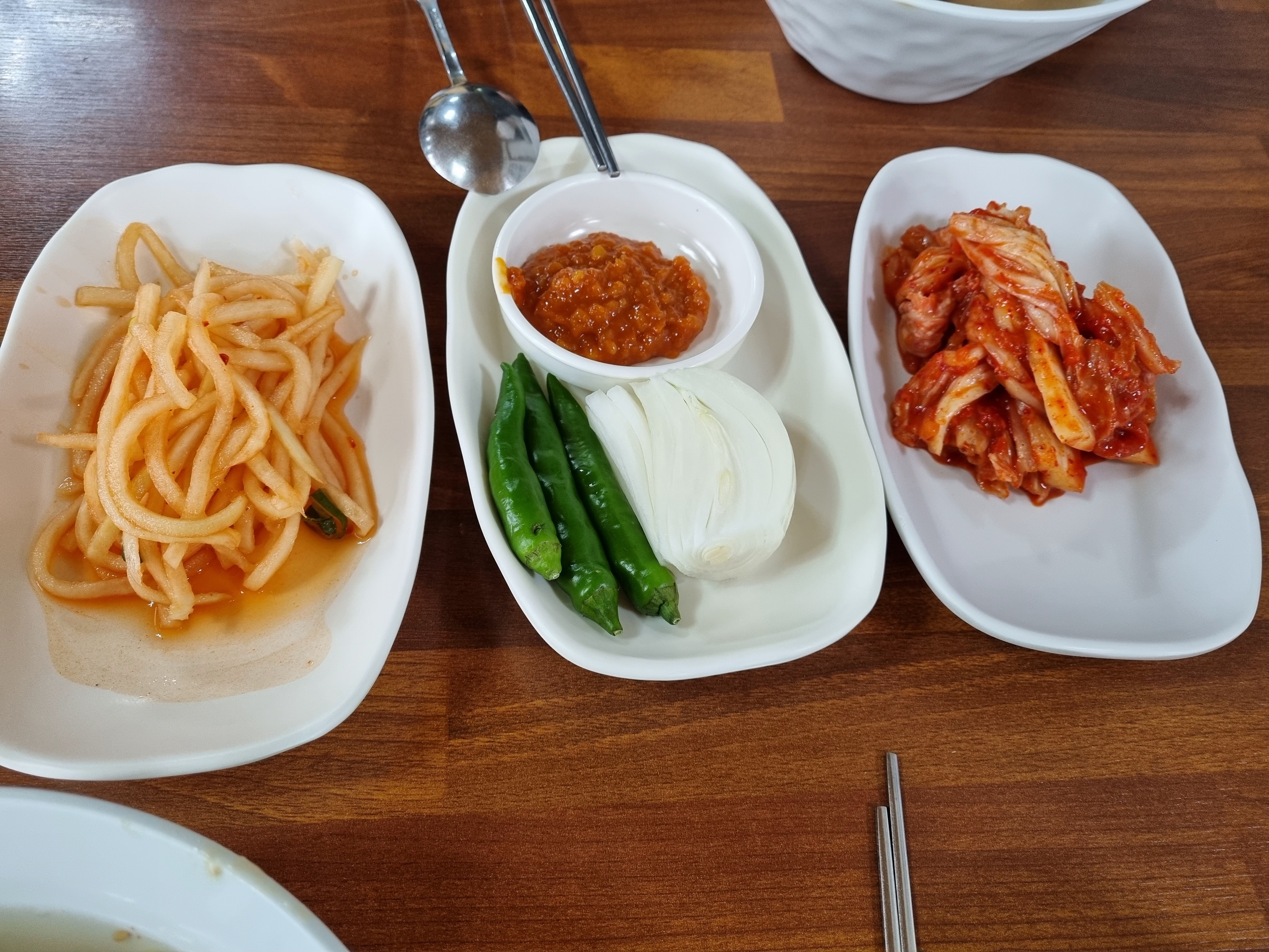 반찬은 김치와 생채, 양파, 고추가 나온다. 김치가 맛있었다.▼