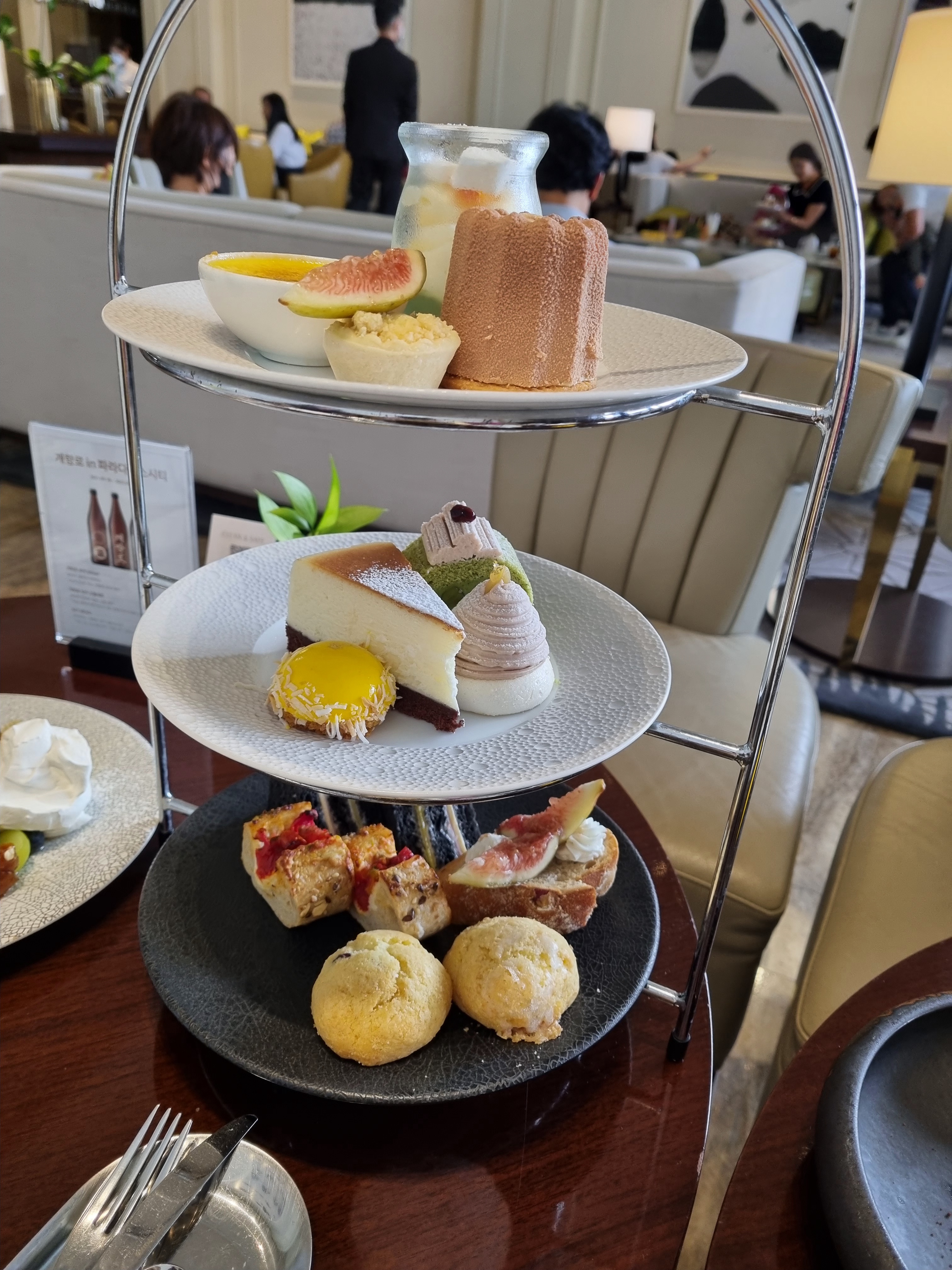 아래는 애프터눈티세트의 3단 트레이. 특히 1단의 스콘(사진은 안 찍었지만 클로티드 크림과 잼이 같이 나와서 발라먹었다)과 3단의 크렘 브륄레가 좋았다. 가을이라 무화과를 주제로 한 건지 곳곳에 들어가 있다.▼