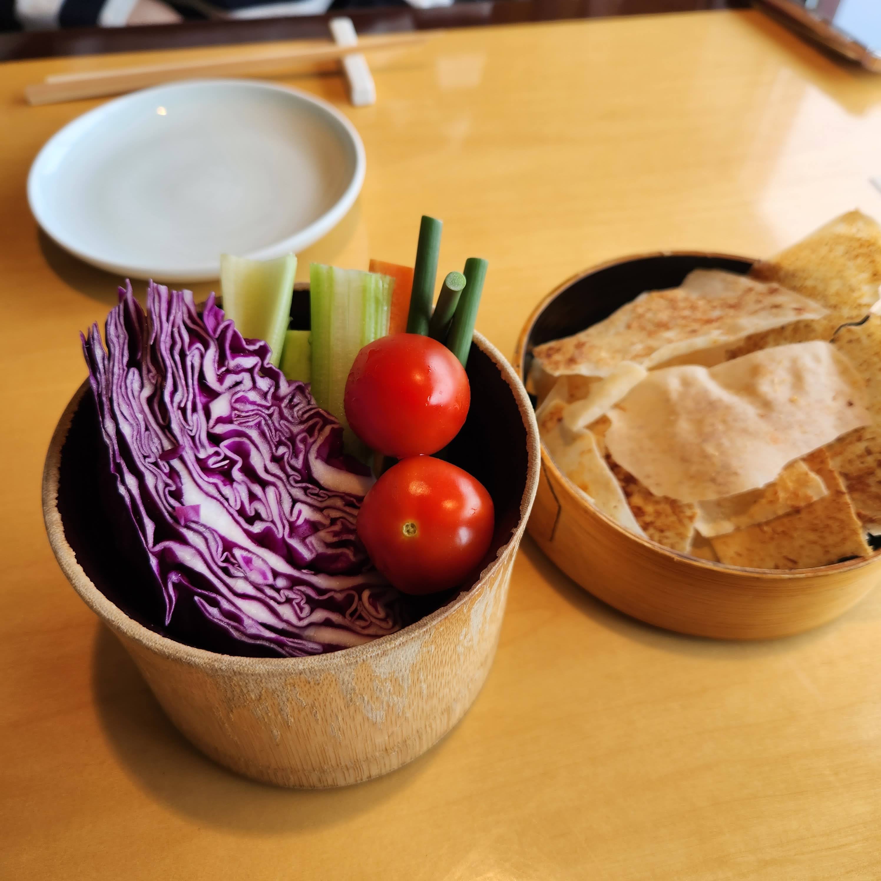 처음에 주전부리로 야채와 과자(?)같은 게 나왔는데 야채가 손질도 잘 되어있고 싱싱해서 맛이 좋았다. 이때만 해도 좋았으나...▼