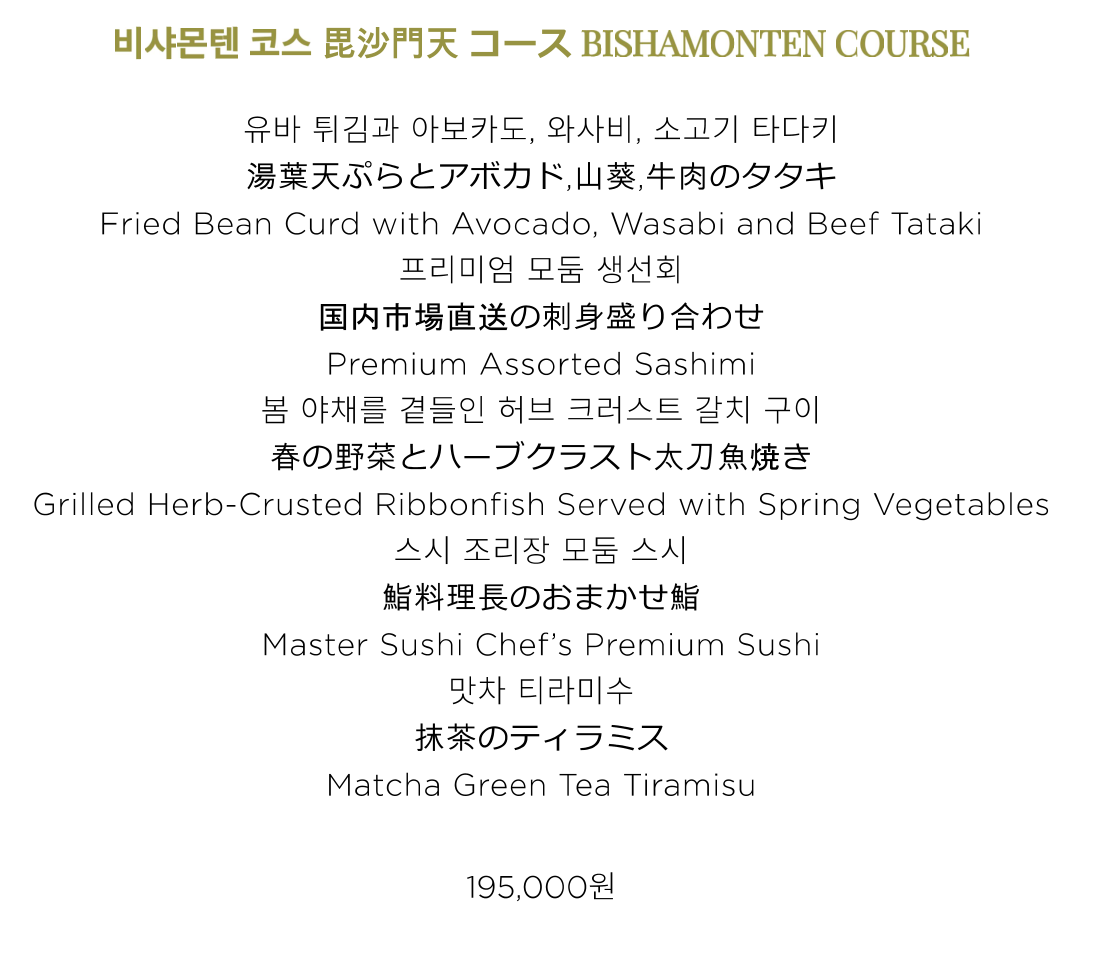 오마카세는 예약이 불가해서 코스로 먹었다. 점심 코스 요리 중 가장 비싼 '비샤몬텐코스'로 주문했다. 무려 195,000원이다.▼