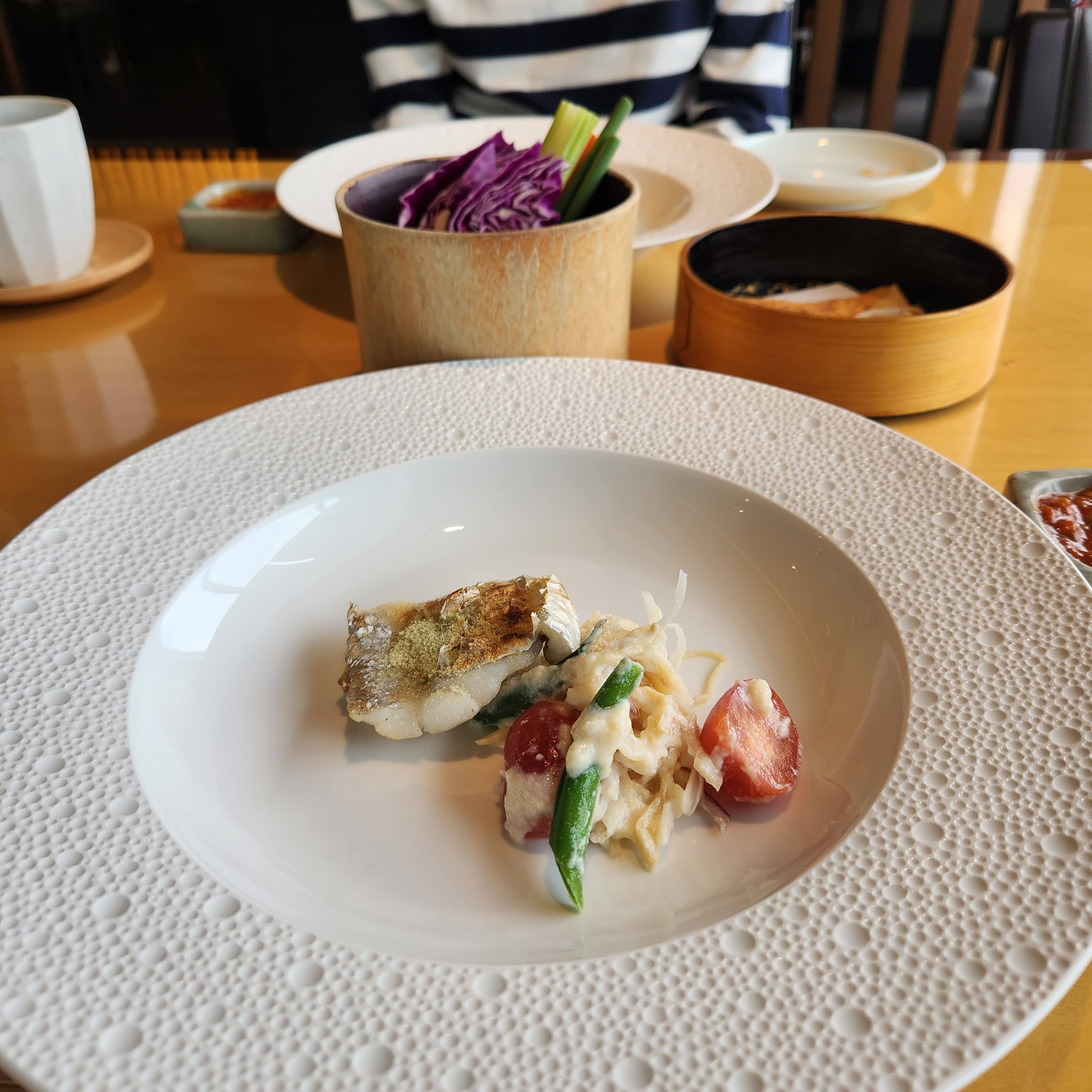 봄 야채를 곁들인 허브 크러스트 갈치 구이. 직원에게 물어보니 가시를 최대한 제거했다고 답하긴 했다. 그래도 먹다보니 몇 개 나왔다. 내가 가시많은 생선을 싫어해서 별로였다. 하지만 아내는 좋았단다. ▼