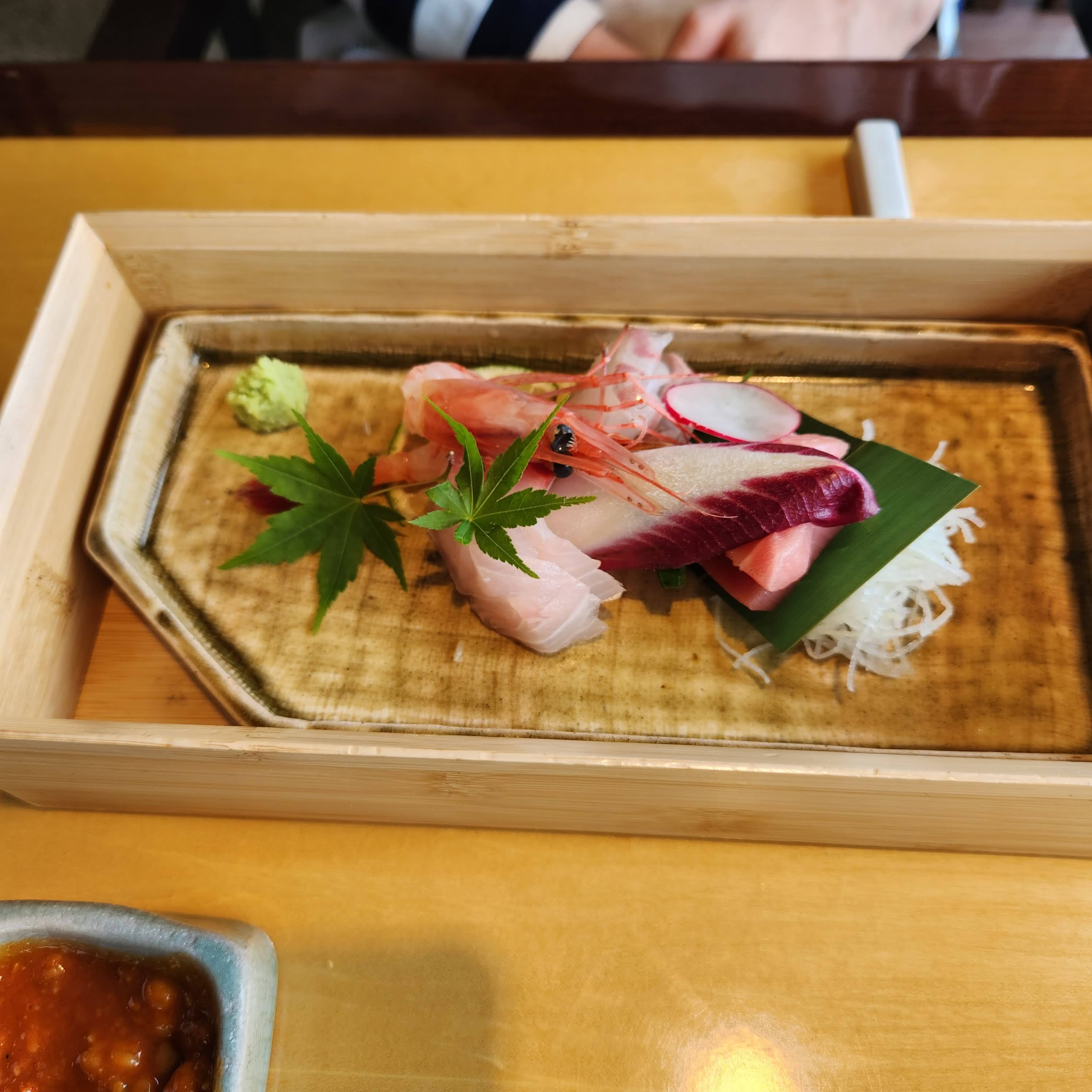 이 다음이 스시 조리장 모둠 스시인데 나오기까지 상당히 오래 걸렸다. 중간에 직원이 와서 한 번 사과하면서 주문이 밀려서 오래 걸린다고 말해주더라. 근데 매장 테이블이 만석도 아니었는데 코스요리를 제 때 내오지 못하는게 말이 되나? 일류 호텔 레스토랑인데? 좀 이해는 안 된다.