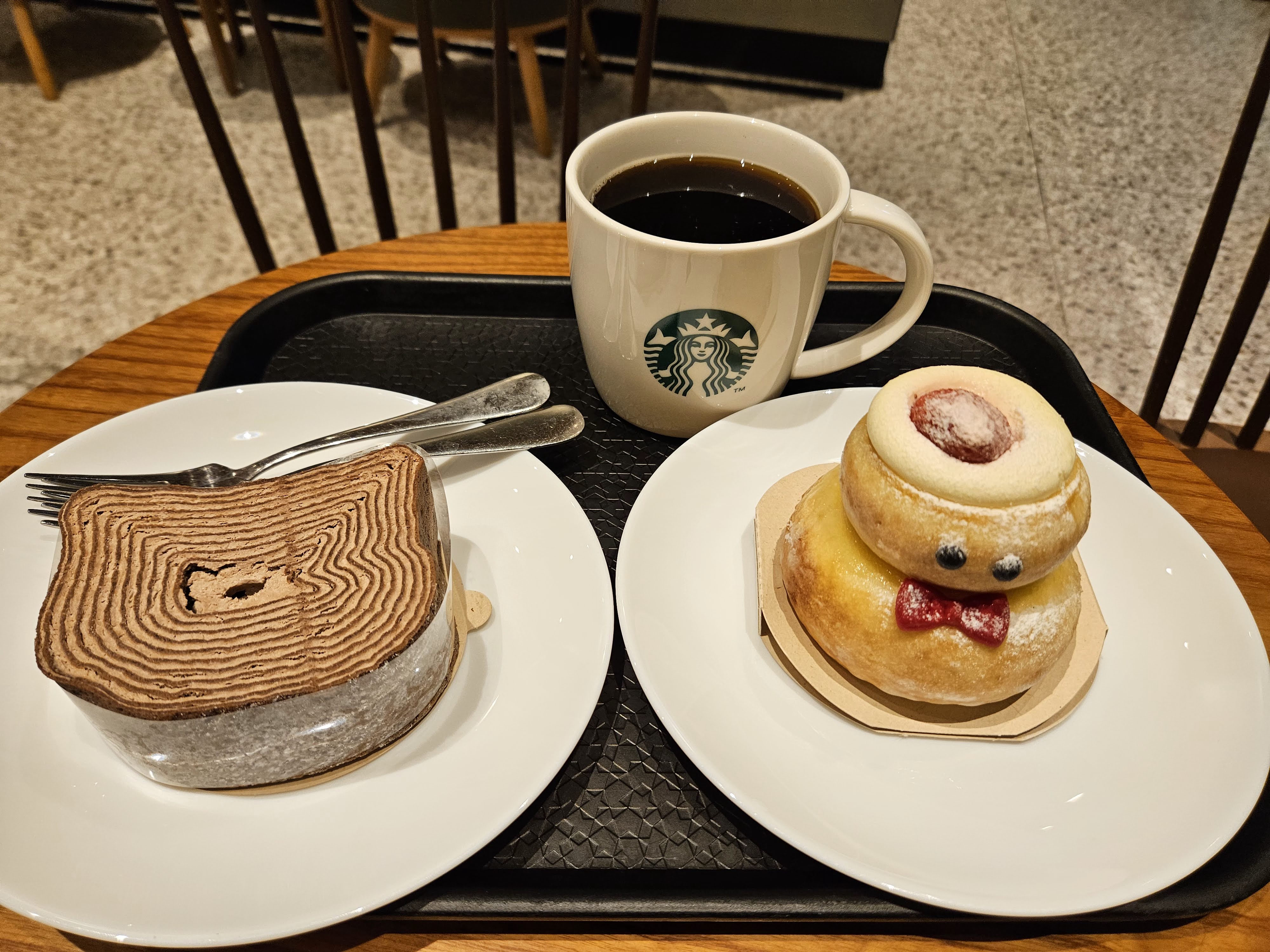 부쉬 드 노엘 초코 크레이프롤 7900원, 스노우맨 바움쿠헨 9500원, 디카페인 아메리카노 4800원 ▲